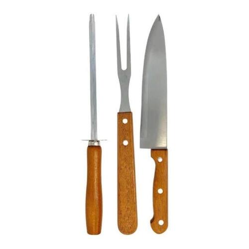 Kit 3 Peças Para Churrasco Com Cabo De Madeira Aço Inox Ideal para quem deseja preparar carnes com praticidade, precisão e estilo. Composto por três peças essenciais faca, chaira e garfo trinchante, este conjunto foi pensado para oferecer alto desempenho tanto no uso doméstico quanto . A faca de corte possui lâmina em aço inox de alta qualidade, garantindo cortes limpos, rápidos e eficientes, mesmo nas carnes mais resistentes. A chaira é perfeita para manter o fio da faca sempre alinhado, proporcionando cortes mais seguros e precisos. Já o garfo trinchante conta com dentes firmes e cabo ergonômico, ideal para firmar as peças de carne durante o corte ou servir com facilidade. Todos os cabos são resistente, com pegada confortável e segura, mesmo em ambientes de calor e alta umidade. O kit acompanha embalagem blister prática e resistente, ideal para armazenamento, exposição no ponto de venda ou até mesmo para presentear amantes de um bom churrasco. Perfeito para churrasqueiros exigentes, chefs ou entusiastas da gastronomia, este kit une funcionalidade, resistência e elegância para elevar sua experiência na cozinha ou na churrasqueira