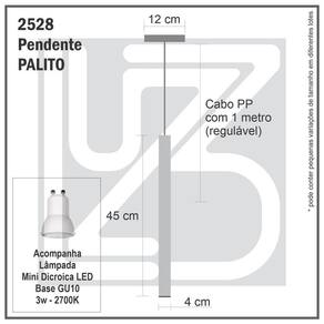 Kit 3 Pendente Tubo Palito Moderno 45cm - Preto Pendente Palito Com Design Slim este pendente é simples e lindo ao mesmo tempo. Proporciona uma luz focada e suave. Com cabo PP 1 metro, regulador e canopla em metal esta luminária é uma tendência na iluminação. Descrição Técnica: - Modelo: PALITO - Acabamento do corpo: PRETO FOSCO - Material: Alumínio Usinado - Tamanho (LxAxP): 4cm x 45cm x 4cm - Cabo: PP com 1m (regulável) - Cor do Cabo: Preto - Soquete: GU 10 - Bivolt: Sim - Canopla: Em metal com 12cm, modelo plano e trava cabo regulador do cabo. Acabamento preto fosco **Lâmpadas vendidas separadamente**