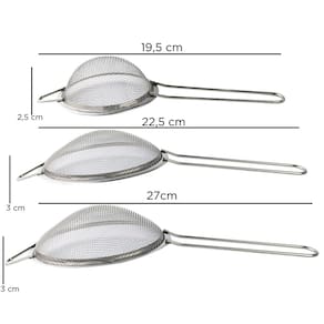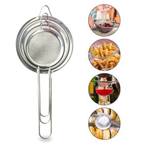 1. Peneira Pequena (Diâmetro: 8 cm) - Ideal para polvilhar ingredientes secos como açúcar de confeiteiro, cacau em pó ou especiarias. - Perfeita para coar líquidos em pequenas quantidades, como sucos, chás e etc. - Tamanho compacto facilita o armazenamento e o manuseio em tarefas menores. 2. Peneira Média (Diâmetro: 10 cm) - Ótima para peneirar ingredientes como farinha, fermento em pó ou grãos. - Adequada para coar caldos, molhos ou separar sólidos de líquidos durante a preparação de suas receitas. - Tamanho versátil, ideal para uso diário na cozinha. 3. Peneira Grande (Diâmetro: 12 cm) - Perfeita para peneirar grandes quantidades de ingredientes como farinha para massas e bolos. - Excelente para lavar e coar frutas, legumes e verduras. - Tamanho amplo permite peneirar e coar com rapidez e eficiência, facilitando o preparo de grandes receitas.