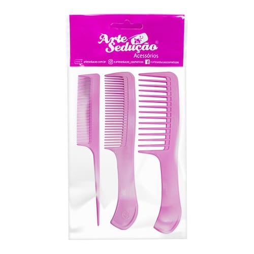 Os pentes de plástico possuem diversos usos e são indicados para pentear e desembaraçar cabelos molhados por serem resistentes, de fácil secagem e evitarem a proliferação de bactérias. São inclusos 3 pentes de diferentes tamanhos e espaçamento entre os dentes, sendo eles pequeno, médio e grande. Os pentes com pouco espaço entre os dentes são indicados para cabelos lisos devido a maior proximidade com os fios que faz com que eles sejam esticados. Já os de maior espaçamento, são indicados para cabelos ondulados os deixando com movimento e aparência natural e para cacheados e crespos facilitando o desembaraçar sem danificar os cachos.