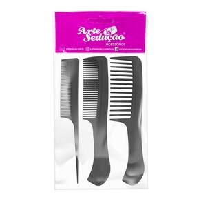 Os pentes de plástico possuem diversos usos e são indicados para pentear e desembaraçar cabelos molhados por serem resistentes, de fácil secagem e evitarem a proliferação de bactérias. São inclusos 3 pentes de diferentes tamanhos e espaçamento entre os dentes, sendo eles pequeno, médio e grande. Os pentes com pouco espaço entre os dentes são indicados para cabelos lisos devido a maior proximidade com os fios que faz com que eles sejam esticados. Já os de maior espaçamento, são indicados para cabelos ondulados os deixando com movimento e aparência natural e para cacheados e crespos facilitando o desembaraçar sem danificar os cachos.