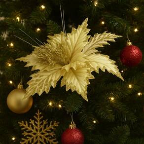 Com 25cm de altura x 16cm de largura, o pick é ideal para compor árvores de Natal, guirlandas, arranjos, vasos ou centros de mesa, garantindo destaque e elegância. Seu design delicado com pétalas decoradas em glitter cria um efeito visual encantador, perfeito para quem busca uma decoração refinada.