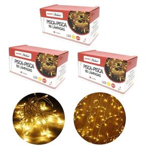 Conteúdo da embalagem: 03 unidades Pisca Pisca 100 Lâmpadas LED Branco Quente Fio Transparente 8 Funções 127V - Master Christmas