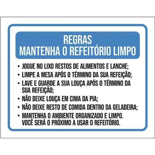 Kit 3 Placa Regras Mantenha Refeitório Limpo Limpe 36x46 Placas de sinalizaço fabricadas com poliestireno de alto impacto PSAI de 2mm e impressão ultravioleta.