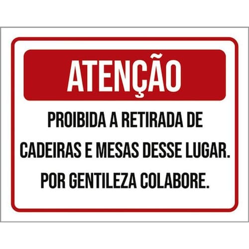 Kit 3 Placas Atenção Proibida Retirada Cadeiras Mesas 36x46 Placas de sinalizaço fabricadas com poliestireno de alto impacto PSAI de 2mm e impressão ultravioleta.