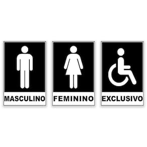 Pacote com: - 1 (uma) unidade de Placa "Banheiro Masculino" - 1 (uma) unidade de Placa "Banheiro Feminino" - 1 (uma) unidade de Placa "Banheiro Cadeirante Exclusivo"