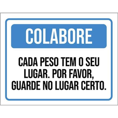 Kit 3 Placas Colabore Cada Peso Tem Seu Lugar 36x46 Placas de sinalizaço fabricadas com poliestireno de alto impacto PSAI de 2mm e impressão ultravioleta.