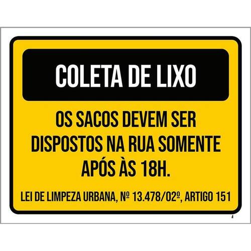 Kit 3 Placas Coleta Lixo Sacos Dispostos Após 18 Horas Placas de sinalizaço fabricadas com poliestireno de alto impacto PSAI de 2mm e impressão ultravioleta.
