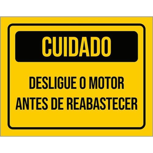 Kit 3 Placas Cuidado O Desligue Motor Antes De Reabastecer Placas de sinalizaço fabricadas com poliestireno de alto impacto PSAI de 2mm e impressão ultravioleta.