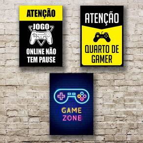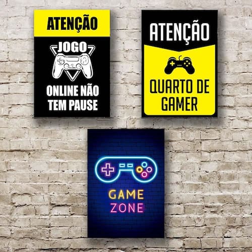 Kit 3 Placas Decorativas Gamers 28,5X20Cm Placa mdf 3mm ideal para decoração de sua casa e ambiente de trabalho Tamanho: 28,5 cm altura 20 cm largura Impressão: Papel fotográfico em alta resolução Fixação: Fita dupla face 3m Cuidados com o produto: Evitar paredes com muita umidades. Ean: 7891054498515