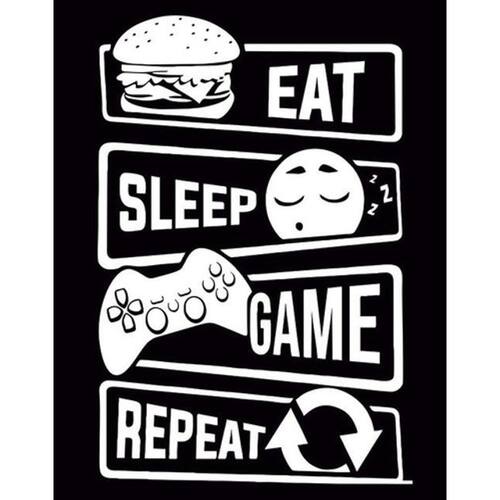 Kit 3 Placas Eat Sleep Game Repeat Preta 36x46 Placas de sinalizaço fabricadas com poliestireno de alto impacto PSAI de 2mm e impressão ultravioleta.