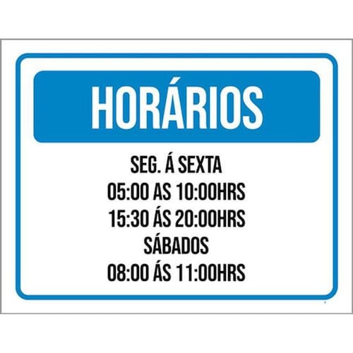 Kit 3 Placas Horários Azul Segunda Sexta 36x46 Placas de sinalizaço fabricadas com poliestireno de alto impacto PSAI de 2mm e impressão ultravioleta.