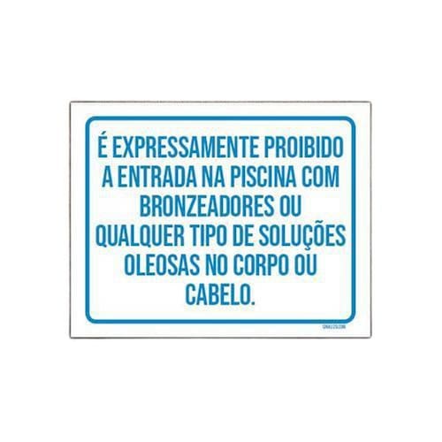 Kit 3 Placas Não Entra Piscina Bronzeador Soluções Oleosas - Informações do Produto: Kit com 3 placas decorativas iguais fabricadas com poliestireno de alto impacto PSAI de 2mm e adesivo vinil automotivo de alta performance. - Medidas: 18cm x 23cm - Fixação: Todas as placas possuem adesivo dupla face para aplicação em qualquer tipo de superfície lisa. de 12 meses e disponibilidade imediata. Marca: Não Informado