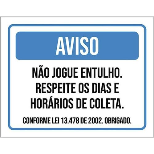 Kit 3 Placas Não Jogue Entulho Respeite Dias Coleta Lei Placas de sinalizaço fabricadas com poliestireno de alto impacto PSAI de 2mm e impressão ultravioleta.