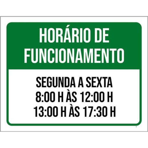 Kit 3 Placas Verde Horário Funcionamento Segunda Sexta Placas de sinalizaço fabricadas com poliestireno de alto impacto PSAI de 2mm e impressão ultravioleta.