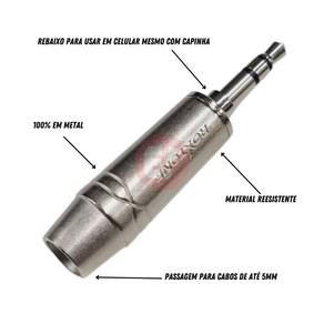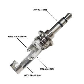 Plug P2 stereo, concha niquelada, contatos niquelados. Design clássico com rebaixo no plug conector para usar em celular mesmo com capinha; Invólucro de liga de zinco resistente; para diâmetro de cabo inferior a 5 mm.Tipo