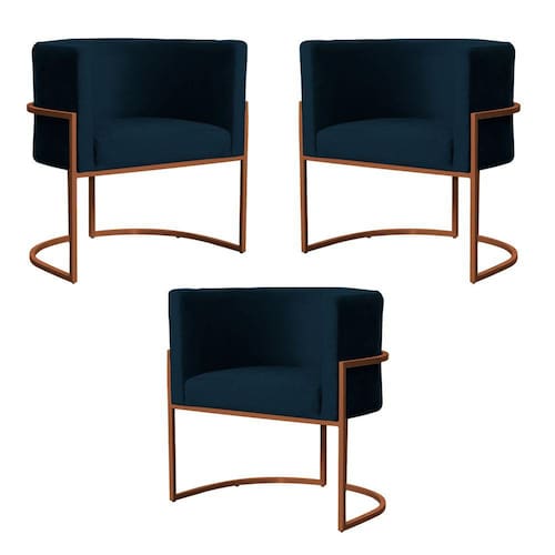 Kit 3 Poltronas Decorativa Luana Base Bronze Veludo Azul Marinho - Montanaris Decor