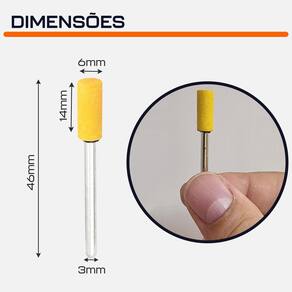 - Marca: Dremax - Kit exclusivo com 3 pontas amarelas - Diâmetro da cabeça: 6mm - Comprimento total: 46mm - Formato: Cilíndrica - Diâmetro da haste: 3mm - Gramatura: Grão 240 - Material da ponta: Óxido de alumínio Amarelo Corundum Premium - As pontas montadas AMARELAS são indicadas para uso geral, com resultado mais fino que as tradicionais pontas rosas - Uso em micro retíficas de qualquer marca com pinça de 3mm - Indicada para desbaste e pré-acabamento em metais, joias, pedras preciosas, vidro, entre outros materiais - Muito utilizada por ourives, relojoeiros, hobbistas e dentistas para desbastar e retificar peças em geral - Seu formato facilita o trabalho em locais de difícil acesso - Garantia: 90 dias contra defeitos de fabricação