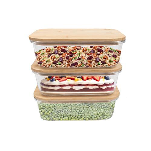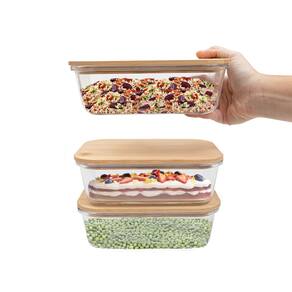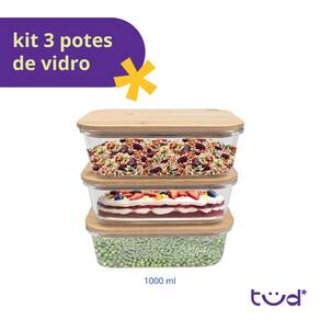"Oii! Tüd bem? Vem saber mais sobre o kit de 3 potes de vidro com tampa de bambu herméticos retangulares de 1L da Tüd!