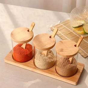 Suporte: o suporte de bambu acomoda os 3 potes, um ao lado do outro, facilitando a organização.
