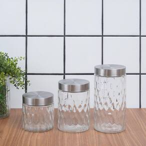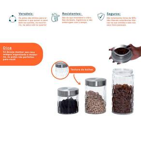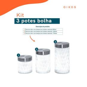 "Conheça o kit de 3 potes bolhas de vidro com tampa inox redondo 800ml, 1300ml e 1700ml da Mozcada.Versátil: para armazenar alimentos, pregadores de roupa, decoração festiva, flores secas, fios e o que mais você quiser guardar.Aço inoxidável: durável, higiênico e não enferruja.Design decorativo: funcional e bonito, com textura de bolhas no vidro.Livre de BPA: não libera substâncias tóxicas na comida.São de vidro e aço inox. Para limpar, basta lavar em água corrente com detergente e secar em seguida.O kit contém: 1 pote bolhas 800ml de vidro com tampa inox redondoComprimento: 11cm Largura: 12cm Altura: 11cm 1 pote bolhas 1300ml de vidro com tampa inox redondoComprimento: 11cm Largura: 17cm Altura: 11cm 1 pote bolhas 1700ml de vidro com tampa inox redondoComprimento: 11cm Largura: 22cm Altura: 11cm" Marca: MOZCADA