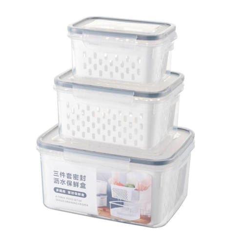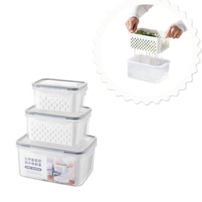 Cada pote acompanha um cesto interno removível, que facilita a drenagem de líquidos e a separação de alimentos, sendo especialmente útil para frutas, legumes lavados ou itens que precisam de ventilação.