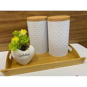 Características: Cor: Branco ou Preto Material: Metal Largura: 10cm Comprimento: 10cm Altura: 19,5cm Tampa: Material da tampa é metal que imita bambu, para que a vedação seja mais eficiente.