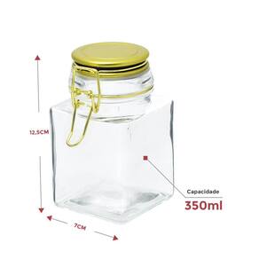 - Kit com 3 potes - Capacidade: 350ml - Tampa com isolamento Hermetico - Cor dourado - Dimensões: 7 x 12,5cm largura x altura - Composição vidro Marca: Não Informado