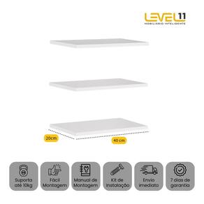 Marca: Level 11 Material: MDP Comprimento: 40 cm (ou 400 mm) Profundidade: 20 cm (ou 200 mm) Espessura: 1,5 cm (ou 15 mm) Peso Suportado (Por Prateleira): 10 kg Tempo de Montagem: 10 minutos