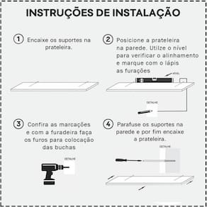 - Instruções de Montagem: Posicione o Produto na Parede, e Marque Com um Lápis o Local Onde Estão os Furos Das Prateleiras Com Uma Furadeira, Faça os Furos Nos Locais Marcados e Insira a Bucha e Suporte de Embutir Que Acompanham o Produto Então Encaixe a Prateleira ou Nicho.