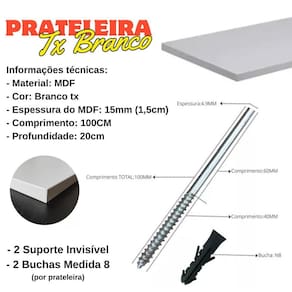 - Material 100% MDF 15 mm de espessura; - Com fita de borda em PVC; - Cor branco fosco nas duas faces; - Medidas 100cm x20cm; - Peso suportado por prateleira 10 kg; - Embalagem segura para que receba seu produto em perfeito estado; Marca: Não Informado