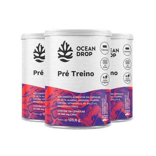 Kit 3 Pré-Treino Ocean Drop Vegano 120 Cápsulas Qual o diferencial do nosso pré-treino O Pré-Treino da Ocean Drop contém aminoácidos, como arginina, taurina e beta-alanina, além de cafeína, que ajuda a aumentar o estado de alerta, melhorar a concentração e otimizar o desempenho em exercícios físicos de resistência. Também possui vitaminas e minerais em suas formas ativas, que auxiliam no metabolismo energético, funcionamento muscular e outras funções vitais. Sua cápsula, feita de gelatina vegetal e água, é adequada para vegetarianos e veganos, bem como para aqueles que buscam um pré-treino livre de carboidratos, aditivos e conservantes Composição: - Cloridrato de L-arginina, bisglicinato de magnésio, taurina, amido, beta-alanina, cafeína 1,3,7-trimethylxanthine , ácido ascórbico, bisglicinato de zinco, acetato de DL-alfa-tocoferol, cloridrato de piridoxina, acetato de retinol, picolinato de cromo e metilcobalamina. - Cápsula de gelatina vegetal e água. - Não contém glúten. Modo de uso: - Sugere-se a ingestão de 4 cápsulas ao dia, de preferência antes de atividades físicas ou conforme recomendação . Contraindicações: - Indicado para pessoas acima de 19 anos. - Este produto não é um . - Contém cafeína; hipertensos devem consumir com atenção. Autorização: - Produto autorizado para comercialização em todo o território nacional através do anexo I da RDC 240/2018 da ANVISA. - AFE do MS 6.02234-1.