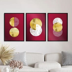 Os quadros possuem um design abstrato com círculos nas cores vinho e dourado, criando um visual contemporâneo e sofisticado. Cada peça tem 33x24cm, ideal para enfeitar qualquer espaço.