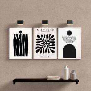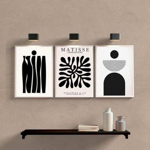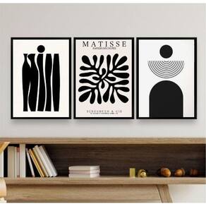 Especificações técnicas: - Título: Kit 3 Quadros Minimalistas Abstratos Geométricos Matisse - Medidas: 45x34cm cada peça - Material do papel: Papel fotográfico brilhante de altíssima resolução - Acabamento: Vidro para proteção da imagem - Moldura: Madeira maciça na cor preta - Pendurador incluso - Embalagem segura com plástico bolha