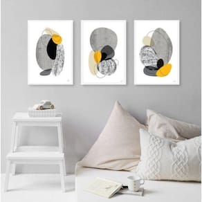 Kit 3 quadros abstratos minimalistas preto cinza amarelo 24x18cm - com vidro Moldura: madeira branca Informações do produto tire todas as suas dúvidas no descritivo abaixo: decoração para quarto, sala, cozinha, escritório, área gourmet e muito mais. Chega de paredes vazias medidas - cada peça tem 24x18cm a5 . Material do papel - papel fotográfico brilhante de altíssima resolução acabamento - todos os quadros são acompanhados de vidro para proteção da imagem. - moldura em madeira maciça na cor preta ou branca conforme produto escolhido e pendurador . - os quadros são embalados de forma segura com plástico bolha com camada dupla de acordo com o tamanho dos quadros. Garantia - garantia de 3 meses. Meu quadro chegou. Como posso fixá-lo Você precisa apenas de um martelo e um prego, pois os quadros já vão acompanhados de penduradores. Esta é a forma mais indicada. Como posso limpar meu quadro A limpeza é feita como um móvel comum da sua casa. Apenas um pano seco ou espanador são suficientes para tal Ean: 7899608390025