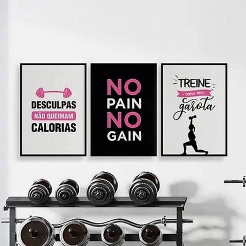 Kit 3 quadros academia feminino 24x18cm Moldura: madeira preta