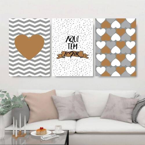 Kit 3 Quadros Aqui Tem Amor Marrom E Cinza - Acabamento: Película de acetato / Moldura: Madeira preta / Tamanho: A4 (20 X 30)