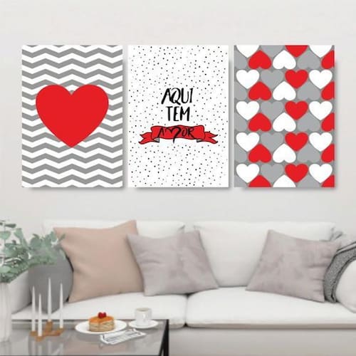 Kit 3 quadros aqui tem amor vermelho e cinza 24x18cm - com vidro Moldura: madeira branca Informações do produto tire todas as suas dúvidas no descritivo abaixo: decoração para quarto, sala, cozinha, escritório, área gourmet e muito mais. Chega de paredes vazias medidas - cada peça tem 24x18cm a5 . Material do papel - papel fotográfico brilhante de altíssima resolução acabamento - todos os quadros são acompanhados de vidro para proteção da imagem. - moldura em madeira maciça na cor preta e pendurador . - os quadros são embalados de forma segura com plástico bolha com camada dupla de acordo com o tamanho dos quadros. Garantia - garantia de 3 meses. Meu quadro chegou. Como posso fixá-lo Você precisa apenas de um martelo e um prego, pois os quadros já vão acompanhados de penduradores. Esta é a forma mais indicada. Como posso limpar meu quadro A limpeza é feita como um móvel comum da sua casa. Apenas um pano seco ou espanador são suficientes para tal