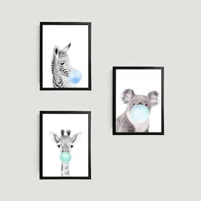Kit 3 quadros bichinhos chicletes azul 45x34cm - com vidro Moldura: madeira preta Informações do produto tire todas as suas dúvidas no descritivo abaixo: decoração para quarto, sala, cozinha, escritório, área gourmet e muito mais. Chega de paredes vazias medidas - cada peça tem 45x34cm a3 . Material do papel - papel fotográfico brilhante de altíssima resolução acabamento - todos os quadros são acompanhados de vidro para proteção da imagem. - moldura em madeira maciça na cor preta e pendurador . - os quadros são embalados de forma segura com plástico bolha com camada dupla de acordo com o tamanho dos quadros. Garantia - garantia de 3 meses. Meu quadro chegou. Como posso fixá-lo Você precisa apenas de um martelo e um prego, pois os quadros já vão acompanhados de penduradores. Esta é a forma mais indicada. Como posso limpar meu quadro A limpeza é feita como um móvel comum da sua casa. Apenas um pano seco ou espanador são suficientes para tal