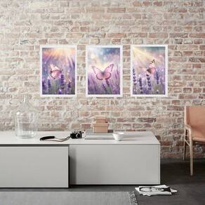 Kit 3 Quadros Borboletas Rosas Lavanda 33X24Cm - Com Vidro