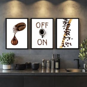 Kit 3 quadros café grãos - on off 33x24cm - com vidro Cor: moldura branca Informações do produto tire todas as suas dúvidas no descritivo abaixo: decoração para quarto, sala, cozinha, escritório, área gourmet e muito mais. Chega de paredes vazias medidas - cada peça tem 33x24cm a4 . Material do papel - papel fotográfico brilhante de altíssima resolução acabamento - todos os quadros são acompanhados de vidro para proteção da imagem. - moldura em madeira maciça na cor preta ou branca conforme produto escolhido e pendurador . - os quadros são embalados de forma segura com plástico bolha com camada dupla de acordo com o tamanho dos quadros. Garantia - garantia de 3 meses. Meu quadro chegou. Como posso fixá-lo Você precisa apenas de um martelo e um prego, pois os quadros já vão acompanhados de penduradores. Esta é a forma mais indicada. Como posso limpar meu quadro A limpeza é feita como um móvel comum da sua casa. Apenas um pano seco ou espanador são suficientes para tal