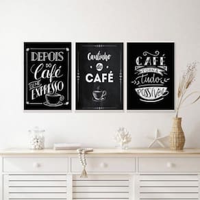 Transforme o seu cantinho do café em um espaço ainda mais especial com o Kit 3 Quadros Cantinho Do Café Tipografia Giz 24X18Cm Vidro. Com moldura de madeira branca, esses quadros são perfeitos para decorar qualquer ambiente, como quarto, sala, cozinha, escritório, área gourmet e muito mais.