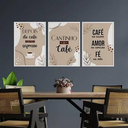 Kit 3 quadros cantinho do café abstrato 45x34cm Moldura: madeira branca Informações do produto Decoração para quarto, sala, cozinha, escritório, área gourmet e muito mais. Chega de paredes vazias Medidas - cada peça tem 45x34cm a3 . Material do papel - papel fotográfico brilhante de altíssima resolução Acabamento - todos os quadros são acompanhados de uma película de acetato para proteção da imagem. - moldura em madeira maciça e pendurador . - os quadros são embalados de forma segura com plástico bolha com camada dupla de acordo com o tamanho dos quadros. - de 3 meses. Meu quadro chegou. Como posso fixá-lo Você precisa apenas de um martelo e um prego, pois os quadros já vão acompanhados de penduradores. Esta é a forma mais indicada. Como posso limpar meu quadro A limpeza é feita como um móvel comum da sua casa. Apenas um pano seco ou espanador são suficientes para tal Marca: Não Informado