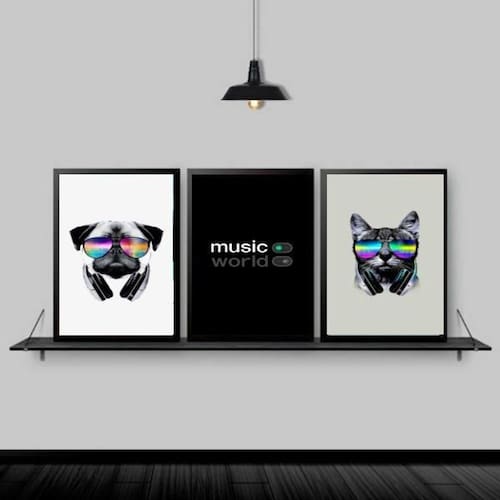 Kit 3 quadros cão e gato música 33x24cm - com vidro Moldura: madeira preta Informações do produto Decoração para quarto, sala, cozinha, escritório, área gourmet e muito mais. Chega de paredes vazias medidas - cada peça tem 33x24cm a4 . Material do papel - papel fotográfico brilhante de altíssima resolução Acabamento - todos os quadros são acompanhados de vidro para proteção da imagem. - Moldura em madeira maciça na cor preta e pendurador . - Os quadros são embalados de forma segura com plástico bolha com camada dupla de acordo com o tamanho dos quadros. - de 3 meses. Meu quadro chegou. Como posso fixá-lo Você precisa apenas de um martelo e um prego, pois os quadros já vão acompanhados de penduradores. Esta é a forma mais indicada. Como posso limpar meu quadro A limpeza é feita como um móvel comum da sua casa. Apenas um pano seco ou espanador são suficientes para tal