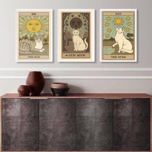 Kit 3 quadros cartas tarot gatos- the sun, the moon, the star 45x34cm Moldura: madeira preta Informações do produto tire todas as suas dúvidas no descritivo abaixo: decoração para quarto, sala, cozinha, escritório, área gourmet e muito mais. Chega de paredes vazias. Medidas - cada peça tem 45x34cm a3 . Material do papel - papel fotográfico brilhante de altíssima resolução acabamento - todos os quadros são acompanhados de uma película de acetato para proteção da imagem. - os quadros são embalados de forma segura com plástico bolha com camada dupla de acordo com o tamanho dos quadros. Garantia - garantia de 3 meses. Meu quadro chegou. Como posso fixá-lo Você precisa apenas de um martelo e um prego, pois os quadros já vão acompanhados de penduradores. Esta é a forma mais indicada. Caso prefira, você pode utilizar uma fita dupla face neste caso, sugerimos de alta qualidade para evitar que descole e seu quadro caia . Como posso limpar meu quadro A limpeza é feita como um móvel comum da sua casa. Apenas um pano seco ou espanador são suficientes para tal Ean: 7892401199352