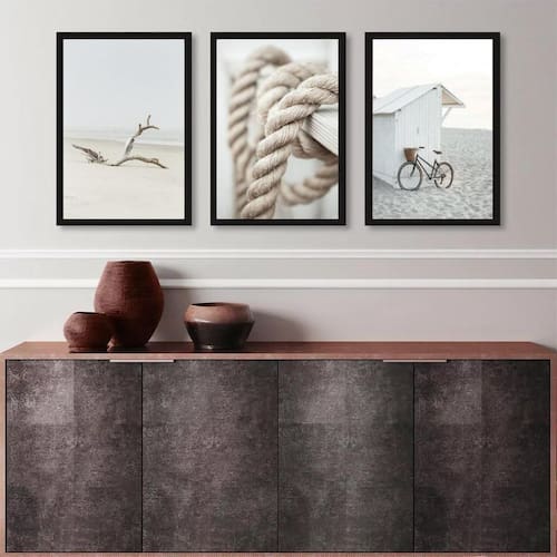 Kit 3 quadros coleção praia branco e bege 33x24cm Moldura: madeira branca Informações do produto tire todas as suas dúvidas no descritivo abaixo: decoração para quarto, sala, cozinha, escritório, área gourmet e muito mais. Chega de paredes vazias medidas - cada peça tem 33x24cm a4 . Material do papel - papel fotográfico brilhante de altíssima resolução acabamento - todos os quadros são acompanhados de uma película de acetato para proteção da imagem. - os quadros são embalados de forma segura com plástico bolha com camada dupla de acordo com o tamanho dos quadros. Garantia - garantia de 3 meses. Meu quadro chegou. Como posso fixá-lo Você precisa apenas de um martelo e um prego, pois os quadros já vão acompanhados de penduradores. Esta é a forma mais indicada. Caso prefira, você pode utilizar uma fita dupla face neste caso, sugerimos de alta qualidade para evitar que descole e seu quadro caia . Como posso limpar meu quadro A limpeza é feita como um móvel comum da sua casa. Apenas um pano seco ou espanador são suficientes para tal Ean: 7894304496712