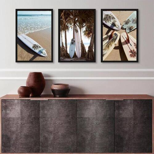Kit 3 quadros coleção praia - pranchas surf 33x24cm Moldura: madeira preta Informações do produto tire todas as suas dúvidas no descritivo abaixo: decoração para quarto, sala, cozinha, escritório, área gourmet e muito mais. Chega de paredes vazias medidas - cada peça tem 33x24cm a4 . Material do papel - papel fotográfico brilhante de altíssima resolução acabamento - todos os quadros são acompanhados de uma película de acetato para proteção da imagem. - moldura em madeira maciça na cor preta ou branca conforme produto escolhido e pendurador móvel que pode ser retirado facilmente caso deseje fixar com fita dupla face. - os quadros são embalados de forma segura com plástico bolha com camada dupla de acordo com o tamanho dos quadros. Garantia - garantia de 3 meses. Meu quadro chegou. Como posso fixá-lo Você precisa apenas de um martelo e um prego, pois os quadros já vão acompanhados de penduradores. Esta é a forma mais indicada. Caso prefira, você pode utilizar uma fita dupla face neste caso, sugerimos de alta qualidade para evitar que descole e seu quadro caia . Como posso limpar meu quadro A limpeza é feita como um móvel comum da sua casa. Apenas um pano seco ou espanador são suficientes para tal