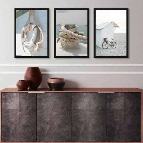 Kit 3 quadros coleção praia soft 24x18cm Moldura: madeira preta Informações do produto tire todas as suas dúvidas no descritivo abaixo: decoração para quarto, sala, cozinha, escritório, área gourmet e muito mais. Chega de paredes vazias medidas - cada peça tem 24x18cm a5 . Material do papel - papel fotográfico brilhante de altíssima resolução acabamento - todos os quadros são acompanhados de uma película de acetato para proteção da imagem. - os quadros são embalados de forma segura com plástico bolha com camada dupla de acordo com o tamanho dos quadros. Garantia - garantia de 3 meses. Meu quadro chegou. Como posso fixá-lo Você precisa apenas de um martelo e um prego, pois os quadros já vão acompanhados de penduradores. Esta é a forma mais indicada. Caso prefira, você pode utilizar uma fita dupla face neste caso, sugerimos de alta qualidade para evitar que descole e seu quadro caia . Como posso limpar meu quadro A limpeza é feita como um móvel comum da sua casa. Apenas um pano seco ou espanador são suficientes para tal