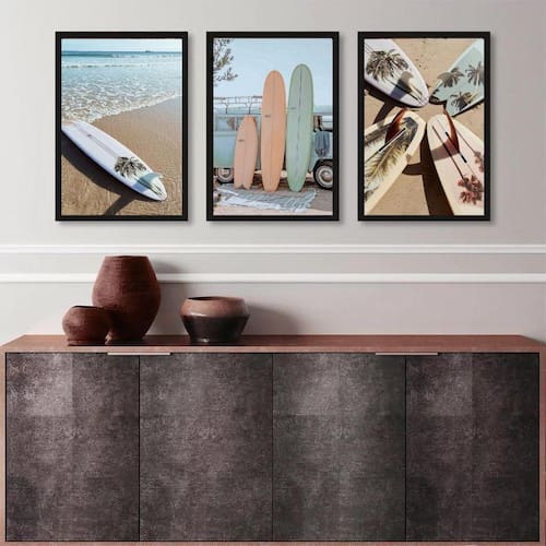Kit 3 quadros coleção praia surf - pranchas 24x18cm Moldura: madeira preta Informações do produto tire todas as suas dúvidas no descritivo abaixo: decoração para quarto, sala, cozinha, escritório, área gourmet e muito mais. Chega de paredes vazias medidas - cada peça tem 24x18cm a5 . Material do papel - papel fotográfico brilhante de altíssima resolução acabamento - todos os quadros são acompanhados de uma película de acetato para proteção da imagem. - os quadros são embalados de forma segura com plástico bolha com camada dupla de acordo com o tamanho dos quadros. Garantia - garantia de 3 meses. Meu quadro chegou. Como posso fixá-lo Você precisa apenas de um martelo e um prego, pois os quadros já vão acompanhados de penduradores. Esta é a forma mais indicada. Caso prefira, você pode utilizar uma fita dupla face neste caso, sugerimos de alta qualidade para evitar que descole e seu quadro caia . Como posso limpar meu quadro A limpeza é feita como um móvel comum da sua casa. Apenas um pano seco ou espanador são suficientes para tal