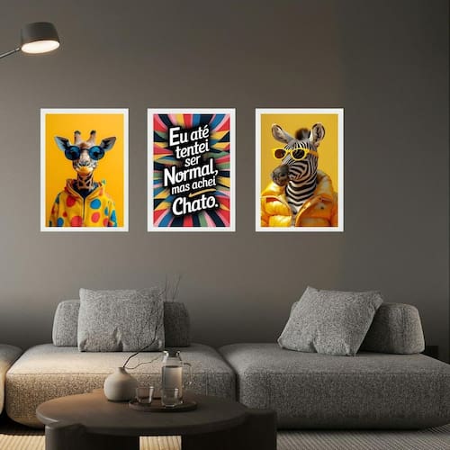 Kit 3 quadros coloridos divertidos e arrojados 24x18cm - com vidro Cor: moldura preta Informações do produto tire todas as suas dúvidas no descritivo abaixo: decoração para quarto, sala, cozinha, escritório, área gourmet e muito mais. Chega de paredes vazias medidas - cada peça tem 24x18cm a5 . Material do papel - papel fotográfico brilhante de altíssima resolução acabamento - todos os quadros são acompanhados de vidro para proteção da imagem. - moldura em madeira maciça na cor preta ou branca conforme produto escolhido e pendurador . - os quadros são embalados de forma segura com plástico bolha com camada dupla de acordo com o tamanho dos quadros. - de 3 meses. Meu quadro chegou. Como posso fixá-lo Você precisa apenas de um martelo e um prego, pois os quadros já vão acompanhados de penduradores. Esta é a forma mais indicada. Como posso limpar meu quadro A limpeza é feita como um móvel comum da sua casa. Apenas um pano seco ou espanador são suficientes para tal